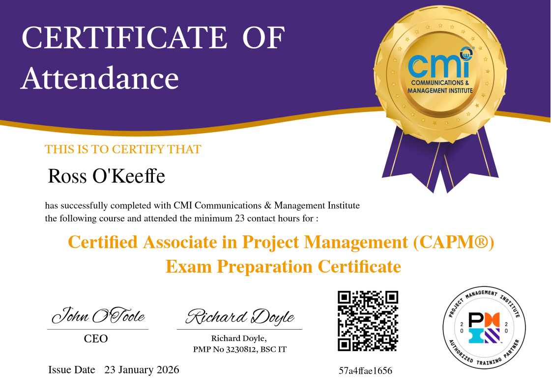 After completing the CAPM® prep course with CMI, participants receive an Attendance Certificate, confirming they have met PMI’s requirement of 23 hours of project management education—a mandatory eligibility criterion for applying for the CAPM® exam.