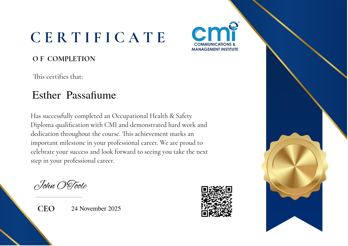 • Successfully completed all modules of the OTHM Level 6 Diploma in Occupational Health and Safety