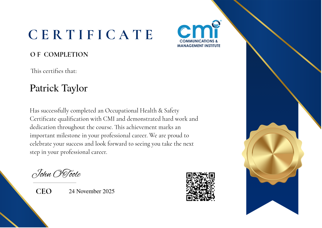 • Successfully completed all modules of the OTHM Level 6 Certificate in Occupational Health and Safety